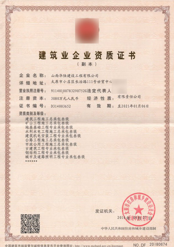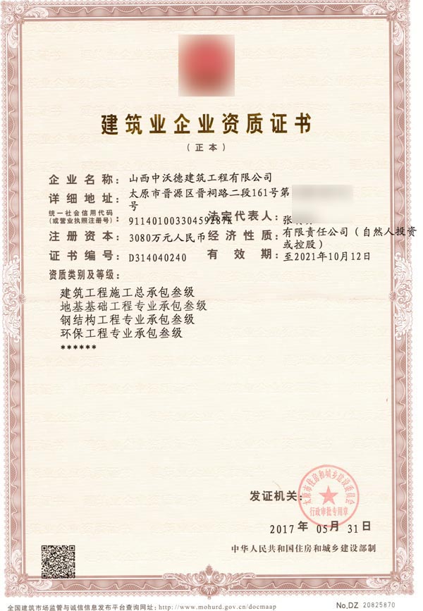山西某建筑工程公司多項建筑資質