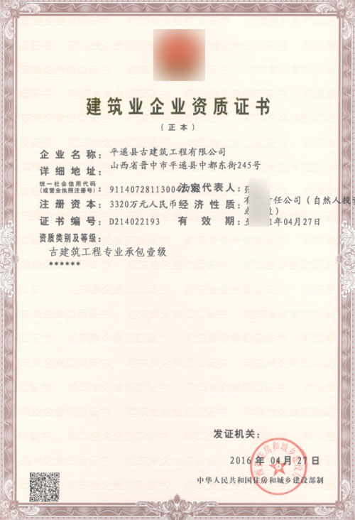 平遙某古建筑公司古建筑工程專業承包一級資質